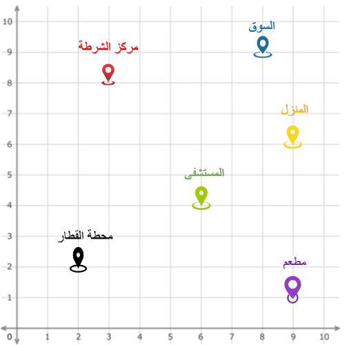 إذا كان طول كل تربيعة هو كيلومترًا واحدًا، كم هي المسافة بين السوق و المطعم؟